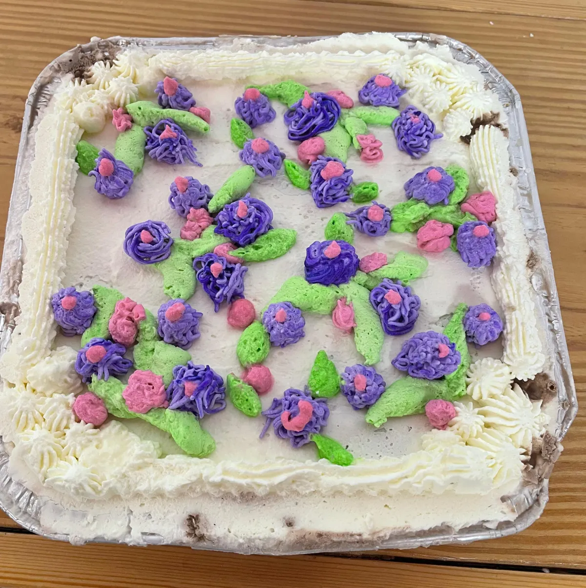 Our party-size layered cake with a crust, 2 different ice cream flavors, and a decorative whipped topping. Chocolate lettering can be added for an additional $10
